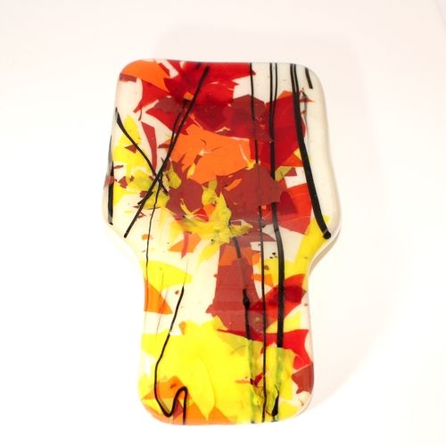 It measures approx 10 cm x 18 cm and is made from Bullseye French Vanilla and Bullseye Autumn Design Facture Streamer Glass.