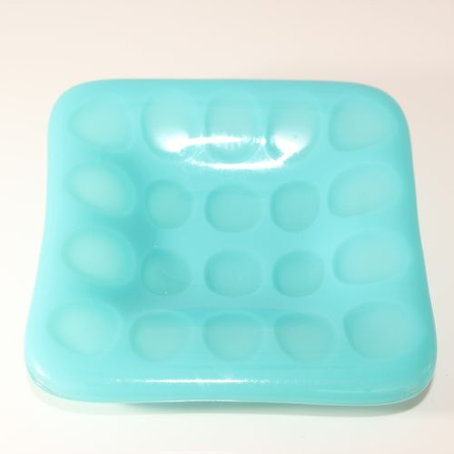 Lovely little square turquoise dish ideal for trinkets and jewellery or the perfect size also for a small tealight candle. It measures approximately 8 cm x 8 cm and is made from a base layer of Bullseye Tekta clear glass and a top layer of Bullseye turquoise opal glass. Before firing in the kiln some clear glass cabachons have been placed, in rows, on top of the turquoise glass - this is to create a dilution design. When diluting with opal glass colours do not fade so this can create wonderfully subtle patterns resembling optical illusions. These trinket dishes although very similar are never identical which makes each one unique. Please note that these dishes are not dishwasher safe and hand washing is recommended.