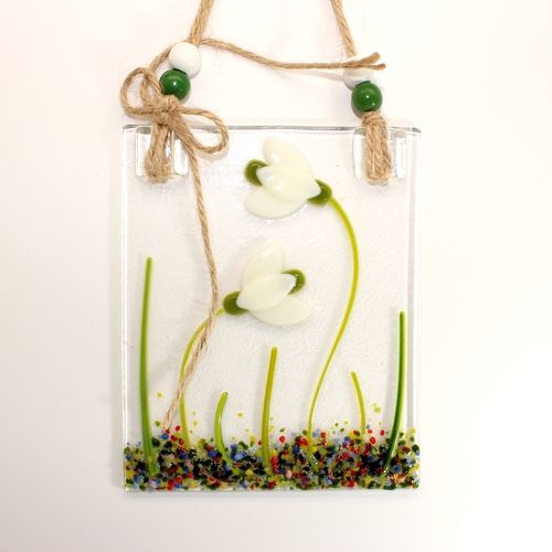 This beautiful and simple design snowdrop wall hanging measures approximately 10 cm x 15 cm. It has a hemp hanging cord which has been decorated with green and white wooden drum beads. The total length of the wall hanging including the hemp cord is approximately 22 cm. The wall hanging features two cute little snowdrops and is made from warm white and pea pod green opal glass on a Bullseye Tekta clear glass background. Although similar each one is never exactly identical due to the fact that all the glass is hand cut so this together with the random nature of the frit/stringer grass and frit flowers which have been incorporated into the design this makes each wall hanging unique.