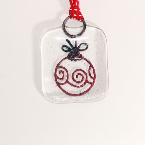 This cute little swirl design Bauble decoration would be perfect either as an addition to your Christmas tree or alternatively it could be used as a unique gift tag to make a Christmas gift extra special! It is made from Bullesye Tekta clear glass and has a copper foil bauble sandwiched inbetween two layers of Tekta clear glass. No two are identical as depending on the texture of the copper foil when it is cut out – ie if it remains smooth after firing it will keep its red coppery colour but if crinkled a little will turn an amazing shade of blue – sometimes of course you will get a combination of both blue and red! This therefore makes each swirl design Bauble decoration unique.